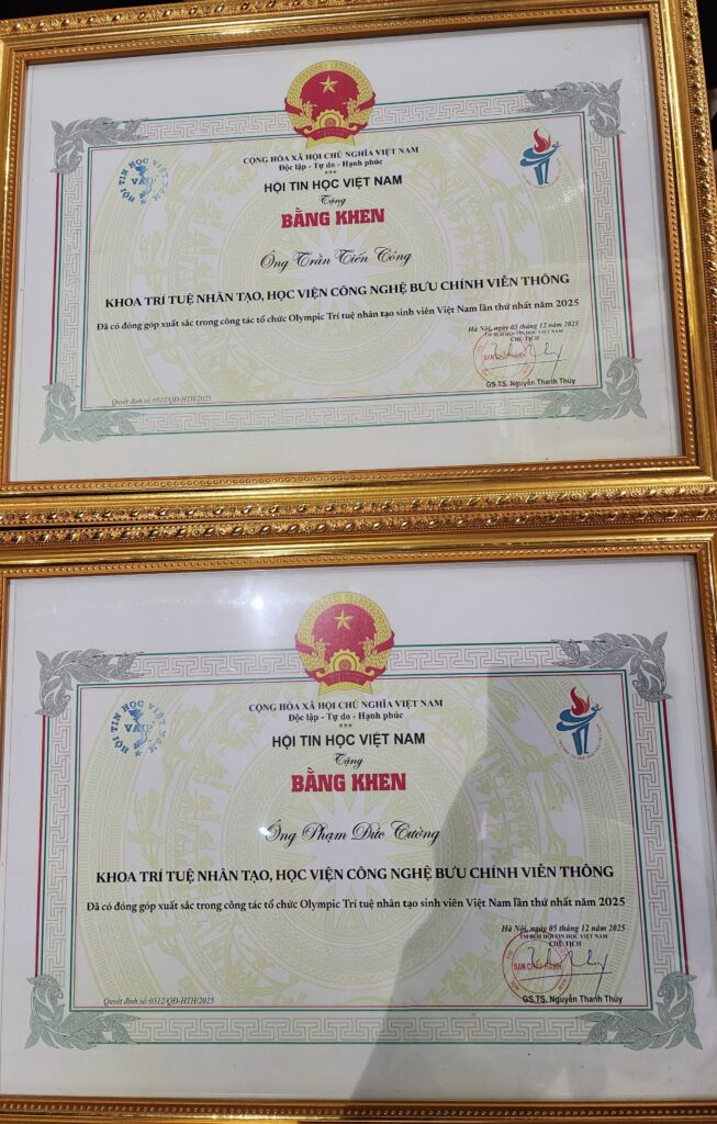 Bên cạnh thành tích của các đội tuyển, hai giảng viên của Khoa AI cũng được nhận bằng khen của Hội Tin học Việt Nam nhờ những đóng góp nổi bật trong công tác tổ chức kỳ Olympic AI đầu tiên: